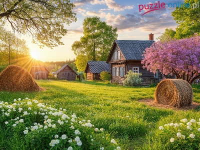 Słoma, Wieś, Bele, Drzewa, Trawa, Domy, Kwiaty