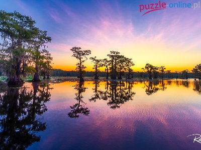Wschód słońca, Jezioro, Cyprysy, Stany Zjednoczone, Drzewa, Caddo Lake, Stan Teksas