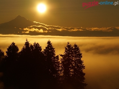Puzzle Drzewa, Góry, Chmury, Słońce
