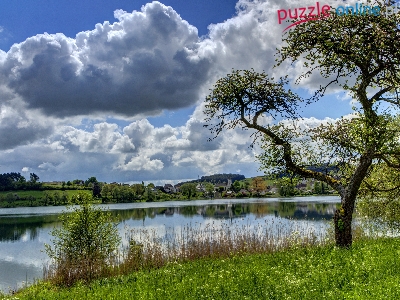 Puzzle Drzewa, Rzeka, Chmury, Trawa