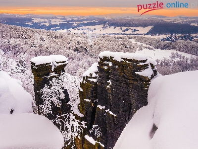 Drzewa, Wschód słońca, Zima, Góry Połabskie, Tisa, Śnieg, Czechy, Skały