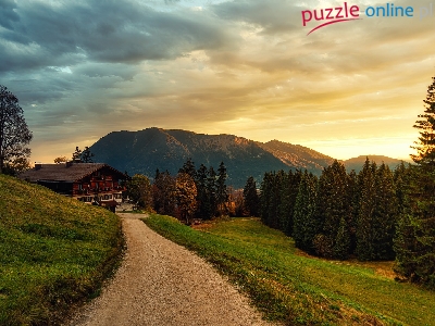 Chmury, Ścieżka, Góry, Drzewa, Jesień, Dom