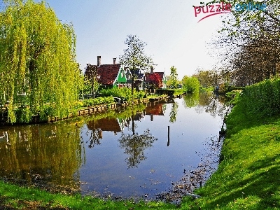 Puzzle Drzewa, Staw, Domki, Trawa
