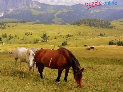 Dolomity, Drzewa, Konie, Góry, Łąki, Włochy, Wzgórza, Domy