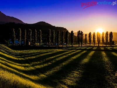 Domy, Drzewa, Wzgórza, Wschód Słońca, Cienie, Wieś