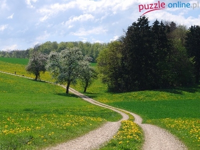 Drzewa, Chmury, Łąka, Droga, Niebo