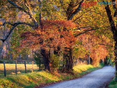 Puzzle Drzewa, Jesień, Droga, Ogrodzenie