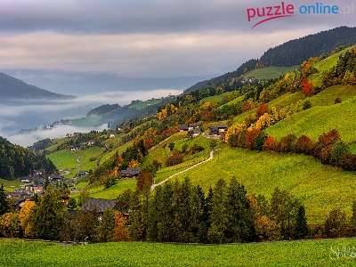 Dolomity, Drzewa, Domy, Mgła, Jesień, Góry, Chmury, Drogi