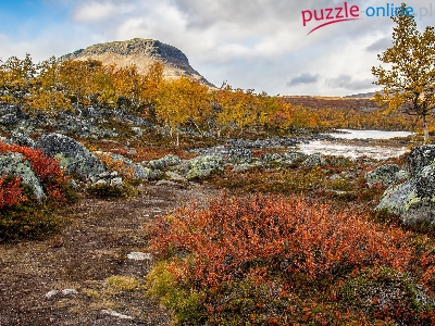 Drzewa, Góra, Jesień, Skały, Kolorowe, Laponia, Finlandia, Żółte, Rośliny