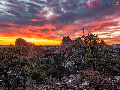 Skały, Kolorado, Stany Zjednoczone, Garden of the Gods, Drzewa, Zachód słońca, Chmury, Góry, Rośliny