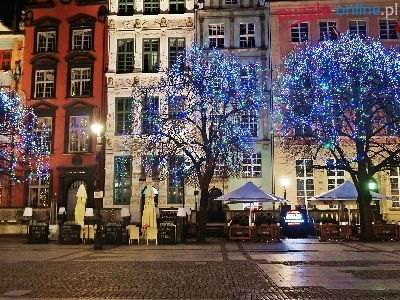 Gdańsk, Drzewa, Świąteczne, Kamienice, Miasto, Noc, Lampki