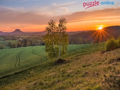 Drzewa, Zachód słońca, Pola, Niemcy, Łąka, Góra Lilienstein, Saksonia