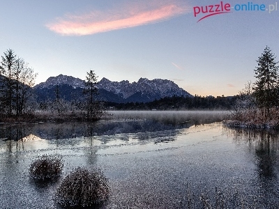 Drzewa, Szron, Jezioro, Góry, Trawy