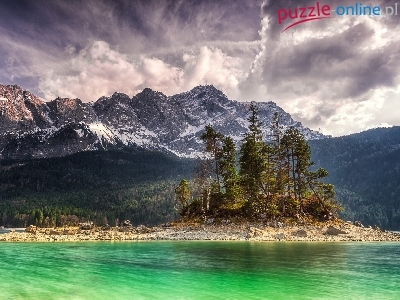 Drzewa, Wysepka, Jezioro, Góry, Chmury