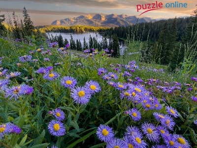 Chmury, Łąka, Góry, Astry, Polana, Jezioro, Kwiaty, Drzewa