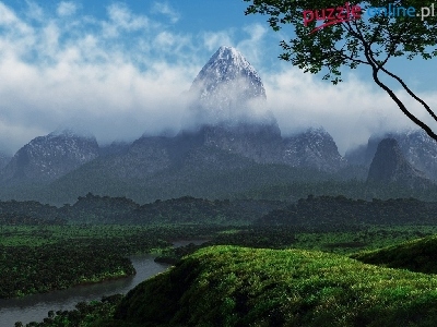 Puzzle Drzewa, Rzeka, Góry, Chmury