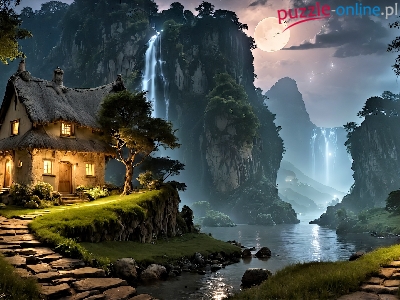Drzewa, Rzeka, Góry, Wąwóz, Dom, Księżyc, Grafika, Wodospad, Oświetlony