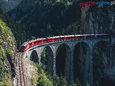 Drzewa, Wiadukt Landwasser, Góry Alpy, Pociąg, Szwajcaria, Kanton Gryzonia, Tory