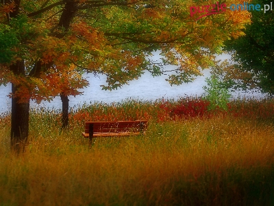 Ławka, Jesień, Rzeka, Drzewa, Trawy