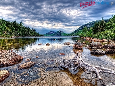 Drzewa, Kamienie, Góry, Jezioro, Chmury