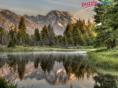 Puzzle Drzewa, Góry, Jezioro, Zieleń