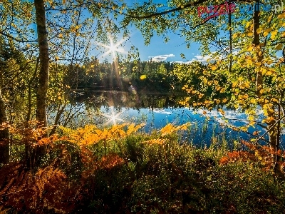 Drzewa, Słońca, Jesień, Jezioro, Promienie