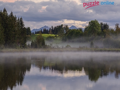 Góry, Drzewa, Jezioro, Chmury, Mgła