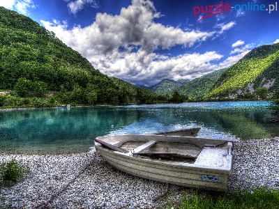 Drzewa, Góry, Łódka, Słowenia , Jezioro, Brzeg