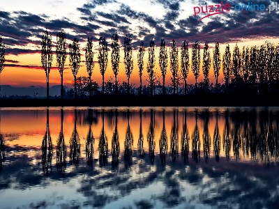 Puzzle Drzewa, Zachód Słońca, Jezioro, Odbicie