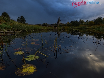 Cerkiew, Drzewa, Jezioro, Niebo, Zachmurzone
