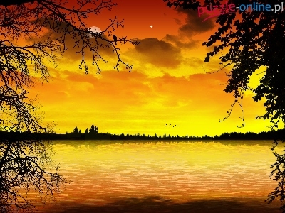 Drzewa, Gwiazda, Zachód, Jezioro, Księżyc
