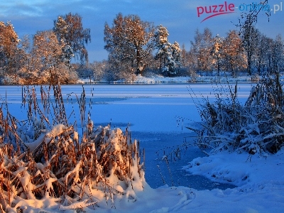 Drzewa, Zima, Zamarznięte, Jezioro, Krzewy