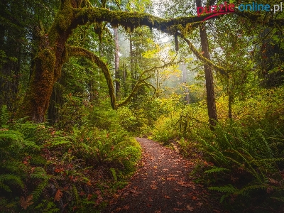 Drzewa, Stany Zjednoczone, Omszałe, Paprocie, Park Narodowy Redwood, Kalifornia, Ścieżka