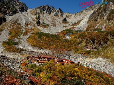 Drzewa, Jesień, Domy, Japonia, Góry Hida, Alpy Japońskie, Karasawa Carl