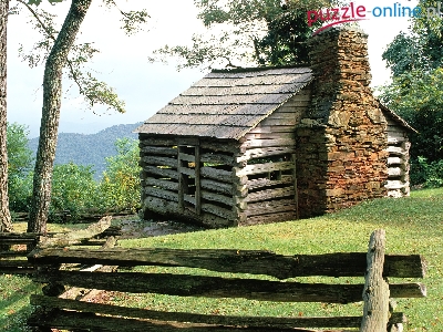 Drzewa, Płot, Chatka, Komin, Trawa
