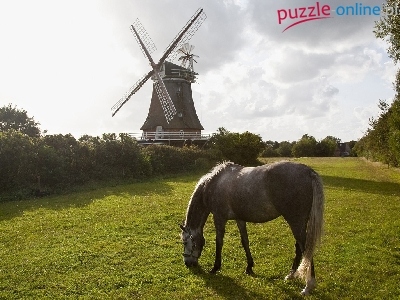 Puzzle Drzewa, Łąka, Koń, Wiatrak