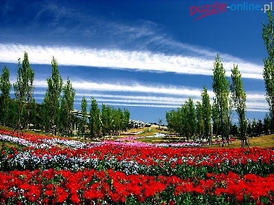 Drzewa, Niebo, Pole, Kwiatowe, Chmury