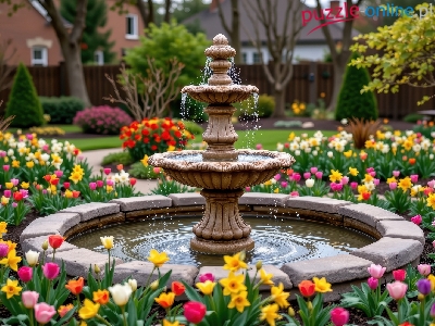 Drzewa, Park, Wiosna, AI, Tulipany, Kamienna, Fontanna, Żonkile, Kwiaty, Kolorowe
