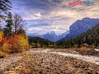 Drzewa, Rzeka, Chmury, Góry, Las, Jesień