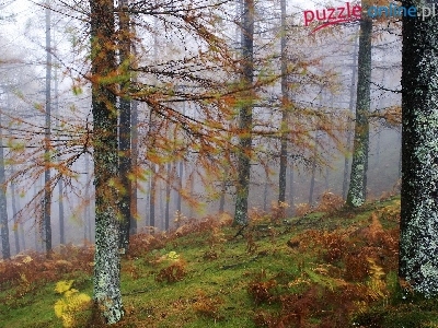 Drzewa, Mgła, Jesień, Las, Paprocie