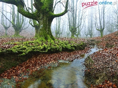 Las, Drzewa, Hiszpania, Omszałe, Jesienny, Mgła, Rzeczka