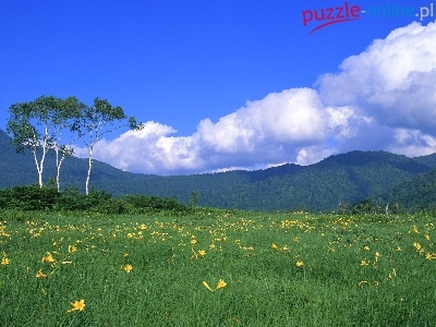 Drzewa, Żółte, Wzgórza, Łąka, Lilie, Chmury