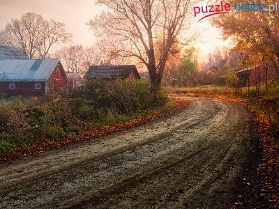 Puzzle Drzewa, Droga, Liście, Budynki