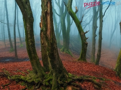 Drzewa, Korzenie, Las, Mgła, Omszałe