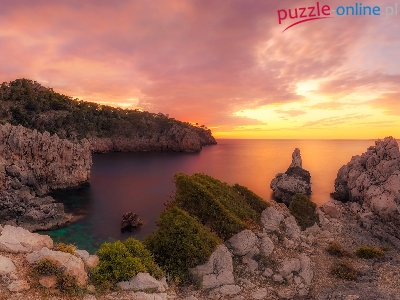 Majorka, Skały, Morze, Drzewa, Hiszpania, Zachód słońca