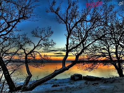 Nagie Drzewa, Słońca, Kamienie, Zachód, Rzeka, Śnieg