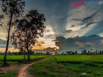 Ścieżka, Niebo, Pola, Drzewa, Chmury