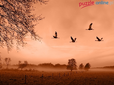 Drzewa, Poranek, Ptaki, Niebo, Mgła