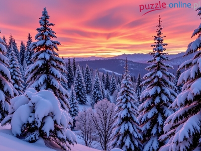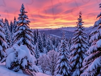 Ośnieżone, Zima, Niebo, Góry, Kolorowe, Zachód słońca, Drzewa