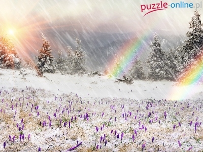 Dwie, Promienie słońca, Krokusy, Śnieg, Choinki, Pole, Zima, Tęcze, Drzewa